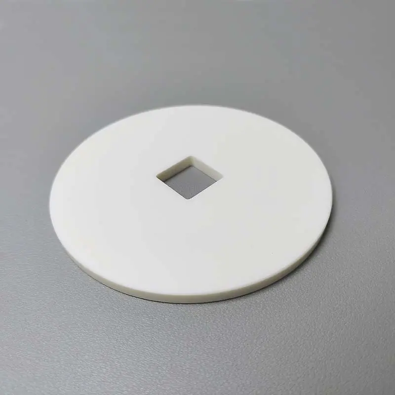 氧化铝陶瓷圆盘结构件兼具高硬度、耐磨损、绝缘性优异、耐高温、耐腐蚀及尺寸稳定性好等优势。其圆盘加中心方孔的设计,能够满足精密机械、电子设备及自动化系统中的定位、隔离和支撑需求,是一种性能稳定、应用广泛的高品质工业陶瓷零件。